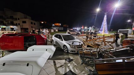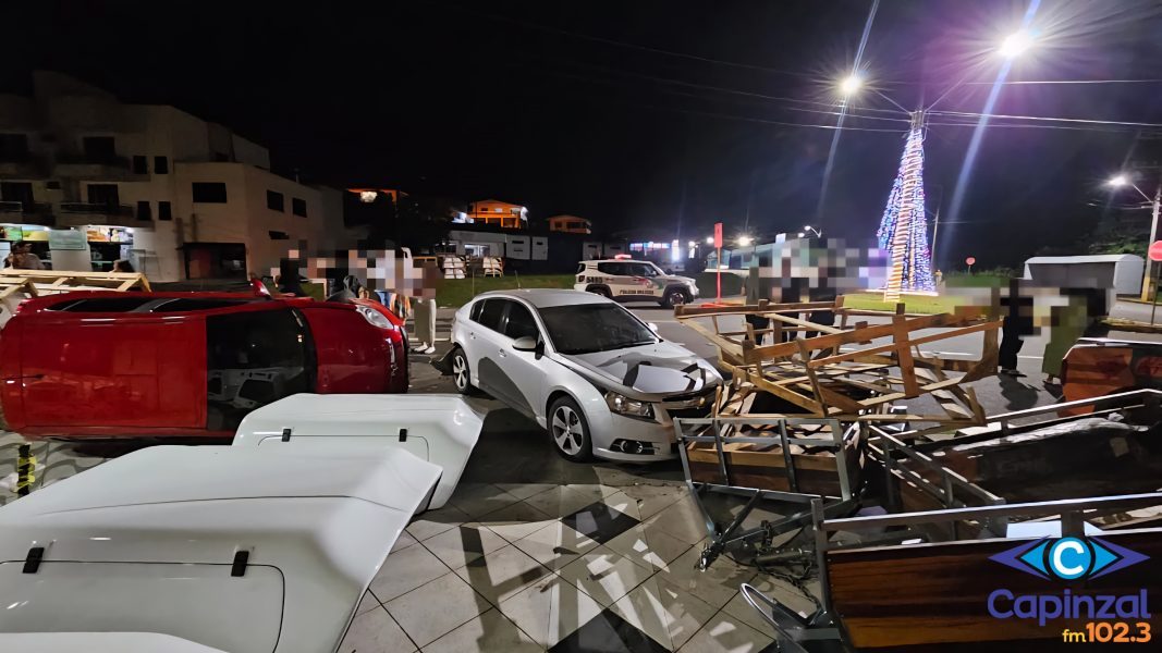 Ao chegar ao local, a guarnição constatou que um veículo Fiat Palio, placas de Capinzal, havia tombado ao realizar uma manobra na rotatória e colidido contra um Chevrolet Cruze, placas de Ouro, que estava estacionado na via. O condutor do veículo causador apresentava visíveis sinais de embriaguez, como forte odor etílico, fala desconexa e arrastada, dificuldade de equilíbrio, além de comportamento agressivo e debochado, com tentativa de se evadir do local.